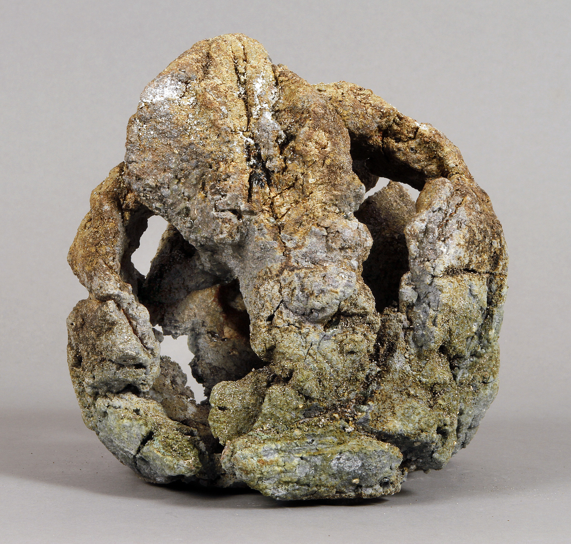 Sculpture en grès. Élaborée avec une argile récoltée localement dans laquelle ont été introduits différents minéraux d’origine volcanique. La température de cuisson portée à 1300° a provoqué la fusion totale ou partielle de ces minéraux (rhyolites, ponces volcaniques, sable noir et cendres volcaniques…), formant ainsi un « émail naturel ». De fait, je préfère parler ici de « fusion minérale » plutôt que d’émail. 2 ou 3 cuissons de haute température sont souvent nécessaires pour atteindre cet état de surface. Cuisson gaz, atmosphère réductrice.