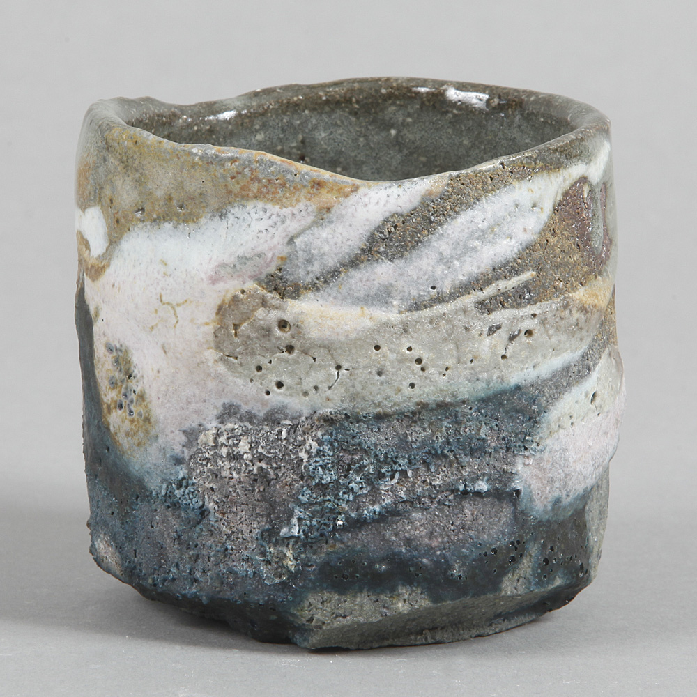 Bol façonné main dans une argile récoltée localement. Pied taillé. L’intérieur est émaillé d’une glaçure verte, faite à partir d’une argile récoltée en Espagne. Plusieurs émaux recouvrent l’extérieur (vert d’argile, blanc de cendres de bois, noir d’un émail au fer) posés en superposition ou non. L’attrait de ce bol réside dans le contraste entre l’aspect satiné des émaux (intérieur et haut du bol), l’onctuosité de l’émail de cendres, et leur rugosité due au type de cuisson (bas du bol et pied). Deux cuissons en gazette en four gaz, atmosphère réductrice, 1300°.