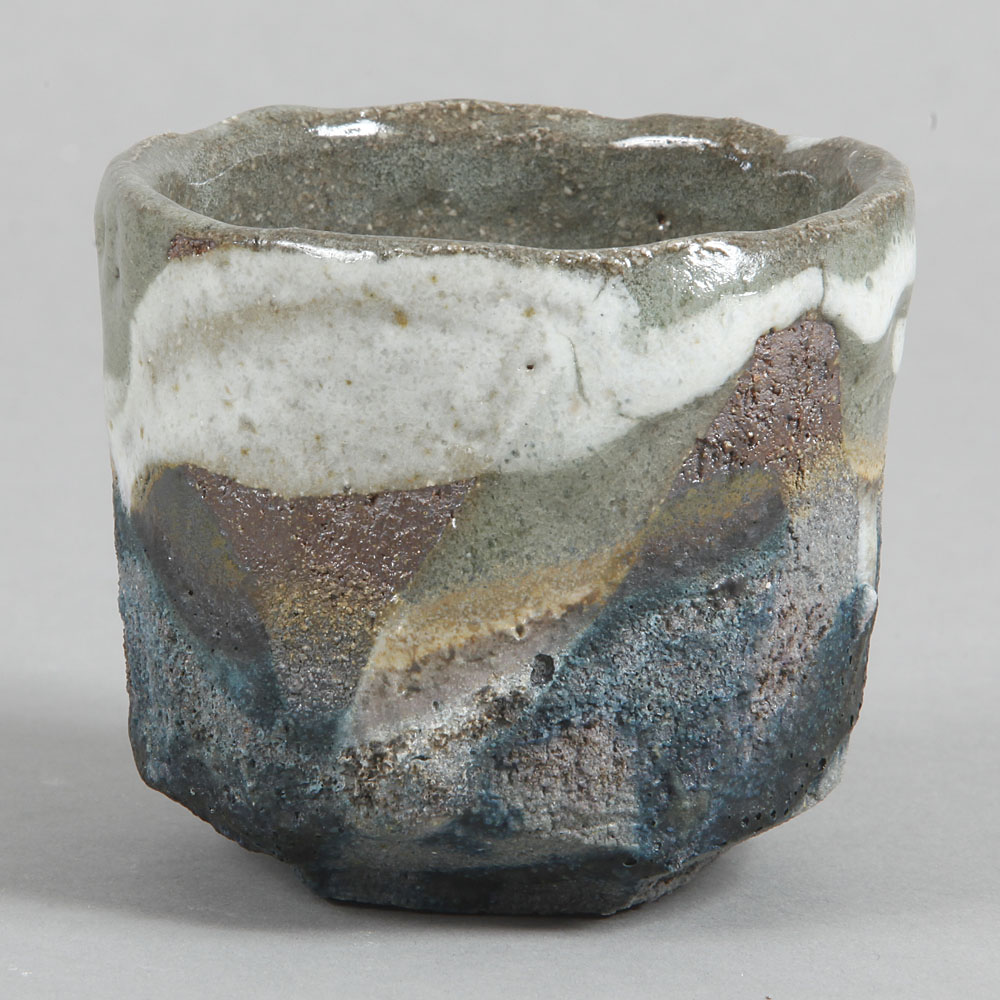 Bol façonné main dans une argile récoltée localement. Pied taillé. L’intérieur est émaillé d’une glaçure verte, faite à partir d’une argile récoltée en Espagne. Plusieurs émaux recouvrent l’extérieur (vert d’argile, blanc de cendres de bois, bleuté d’un émail au fer) posés en superposition ou non. L’attrait de ce bol réside dans le contraste entre l’aspect satiné des émaux (intérieur et haut du bol), leur matité (bas du bol et pied) et les espaces de terre nue. Deux cuissons en four gaz, atmosphère réductrice, 1300°.